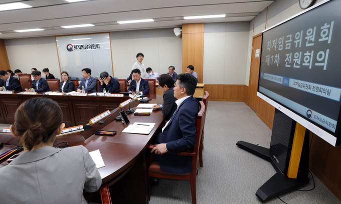 21일 정부세종청사 최저임금위원회에서 내년도 최저임금을 심의할 최저임금위원회 첫 전원회의가 열리고 있다. 연합뉴스 |