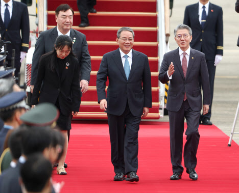 리창 중국 총리가 한중일 정상회의를 하루 앞둔 26일 경기도 성남 서울공항에 도착해 김홍균 외교부 1차관과 함께 이동하고 있다.(사진=연합뉴스) |