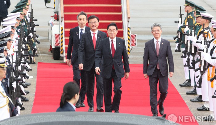 [성남=뉴스핌] 이호형 기자 = ‘한중일 정상회담’ 차 입국한 일본 기시다 총리가 26일 성남 서울공항서 김홍균 외교부 제1차관(맨오른쪽)과 사열을 받으며 차량으로 이동하고 있다. 2024.05.26 leemario@newspim.com |
