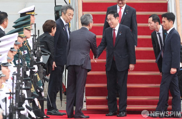 [성남=뉴스핌] 이호형 기자 = ‘한중일 정상회담’ 차 입국한 일본 기시다 총리가 26일 오후 성남 서울공항서 김홍균 외교부 제1차관과 인사를 나누고 있다.2024.05.26 leemario@newspim.com