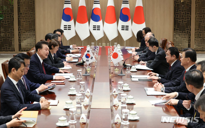 [서울=뉴시스] 전신 기자 = 윤석열 대통령이 26일 서울 용산 대통령실 청사에서 기시다 후미오 일본 총리와 한일 정상회담을 하고 있다. (대통령실통신사진기자단) 2024.05.26. photo1006@newsis.com |