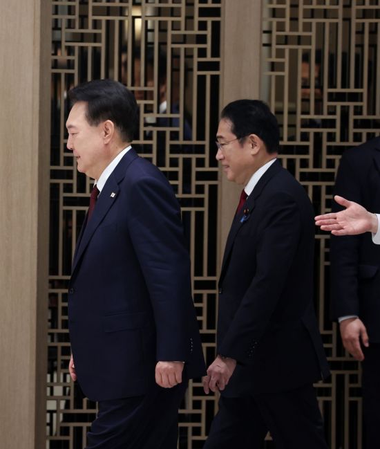 윤석열 대통령이 26일 서울 용산 대통령실에서 열린 한일 정상회담에서 기시다 후미오 일본 총리와 입장하고 있다. [이미지출처=연합뉴스] |