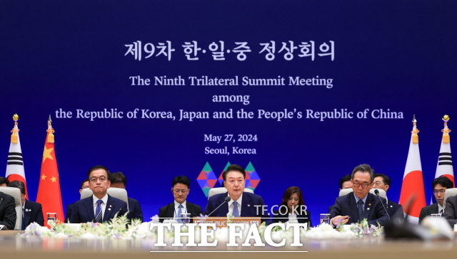 [더팩트ㅣ용산=박숙현 기자] 윤석열 대통령과 기시다 후미오 일본 총리가 27일 한·일·중 정상회의에서 북한의 위성발사 계획 통보에 대해 한목소리로 강력 규탄했다. 리창 중국 국무원 총리는 이에 대한 언급 없이 "세계 집단화와 진영화를 반대해야 한다"며 다른 목소리를 냈다.