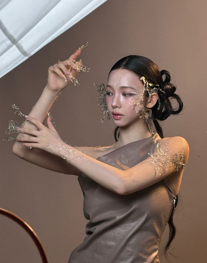 카리나는 28일 개인 채널에 독특한 메이크업과 의상에 특수 분장까지 더한 화보 현장 사진을 올렸다. 사진 속에서 카리나는 양쪽 뺨과 어깨, 손목과 손끝 등에 물거품을 붙인 듯 투명한 장식을 한 모습.