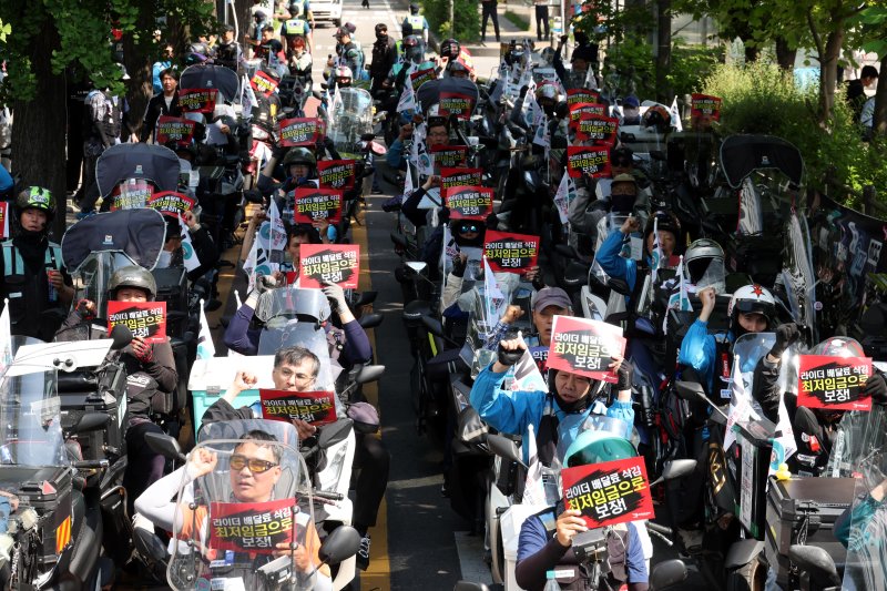 "최저임금 보장해달라" 지난 5월 29일 국회 앞에서 열린 '배달플랫폼노조 라이더 최저임금 보장 촉구 집회'에서 참가자들이 구호를 외치고 있다. 뉴시스 |
