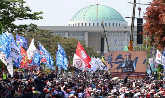 제134주년 세계노동절 기념 전국노동자대회에서 한국노동조합총연맹(한국노총) 조합원들이 김동명 위원장의 대회사를 듣고 있다. [이미지출처=연합뉴스] |