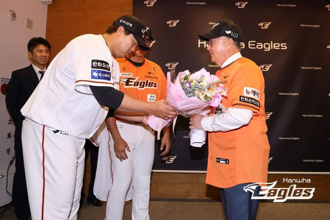 한화 김경문 감독(오른쪽)이 박종태 대표이사로부터 꽃다발을 받고 포즈를 취하고 있다. /한화 이글스 제공 |