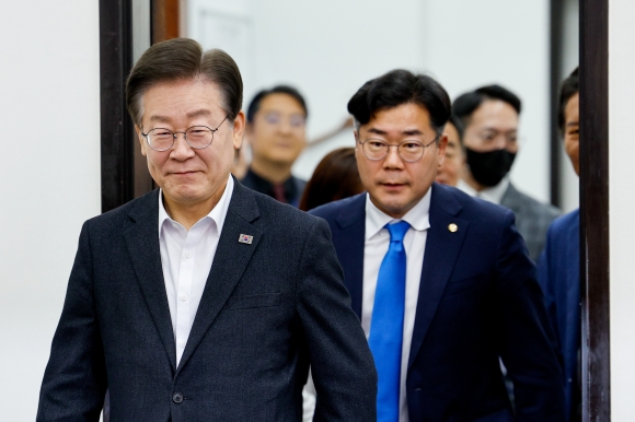 최고위 입장하는 민주당 지도부 - 이재명(왼쪽) 더불어민주당 대표와 박찬대 원내대표가 5일 오전 서울 여의도 국회에서 열린 최고위원회의에 입장하고 있다. 뉴스1 |