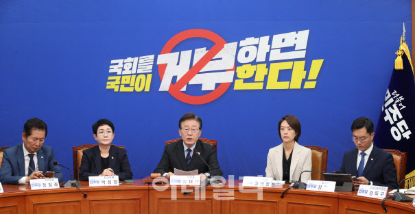 이재명(가운데) 더불어민주당 대표가 10일 오전 서울 여의도 국회에서 열린 최고위원회의에서 발언을 하고 있다. 사진 왼쪽부터 정청래·박정현 최고위원, 이 대표, 고민정·장경태 최고위원.(사진=이데일리 노진환 기자) |