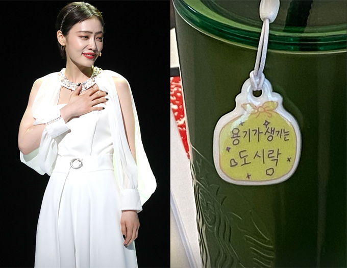 지난 11일 김히어라는 자신의 인스타그램 스토리에 사진 한 장을 게시했다. 사진 속에는 "용기가 생기는 도시락"이라고 적힌 키링이 달린 텀블러가 담겼다.