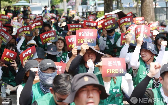 [서울=뉴스핌] 이호형 기자 = 실질임금 인상! 최저임금 대폭인상! 간접고용노동자 원청교섭 쟁취! 공무원보수위원회 비정규직 배제 규탄 및 진짜 사장 윤석열 교섭요구! 민주일반연맹 결의대회가 12일 오후 서울 용산구 전쟁기념관 앞에서 열린 가운데 참석자들이 구호를 외치고 있다.2024.06.12 leemario@newspim.com