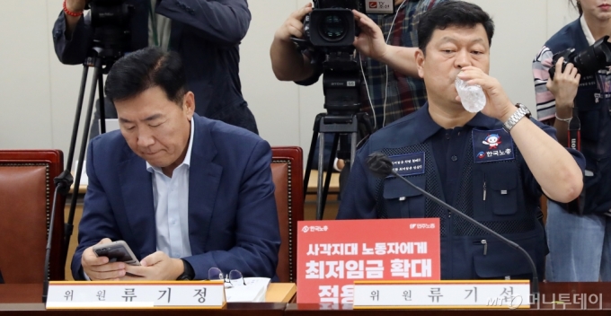 (세종=뉴스1) 김기남 기자 = 13일 세종시 정부세종청사에서 열린 최저임금위원회 제4차 전원회의에 참석한 류기섭 근로자위원(오른쪽)이 회의 시작 전 물을 마시고 있다. 2024.6.11/뉴스1 Copyright (C) 뉴스1. All rights reserved. 무단 전재 및 재배포, AI학습 이용 금지. /사진=(세종=뉴스1) 김기남 기자 |