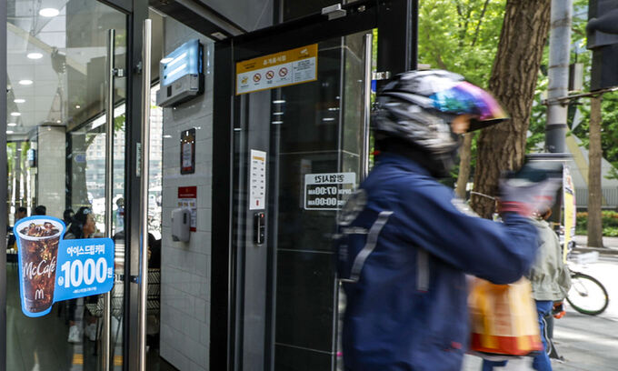 서울시내 한 햄버거 프랜차이즈 매장에서 배달 라이더가 나오고 있다. 뉴시스 |