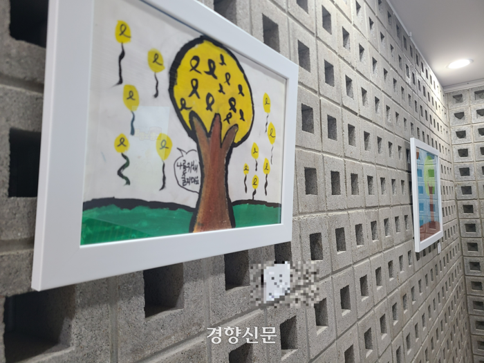 지난 11일 경기 안산시 단원구에 있는 4·16민주시민연구원 미래희망관 1층에 제주 청소년들이 그린 그림이 전시돼 있다. 김태희기자 |