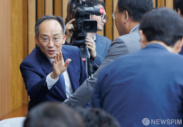 [서울=뉴스핌] 윤창빈 기자 = 추경호 국민의힘 원내대표가 18일 오전 서울 여의도 국회에서 열린 원내대책회의에 참석하고 있다. 2024.06.18 pangbin@newspim.com