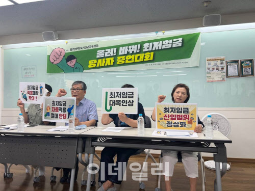 비정규직·특수고용 노동조합 등으로 구성된 ‘올려 바꿔 최저임금 공동행동’은 18일 오전 10시 30분 서울 마포구의 서울시어르신돌봄종사자종합지원센터마포쉼터에서 ‘올려! 바꿔! 최저임금 임금 당사자 증언 대회’을 열었다.