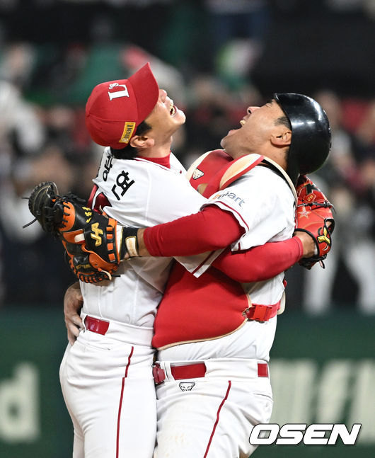 [OSEN=인천, 이대선 기자] 한국시리즈 우승 확정 후 SSG 김광현과 이재원이 포옹하며 환호하고 있다. 2022.11.08 /sunday@osen.co.kr |