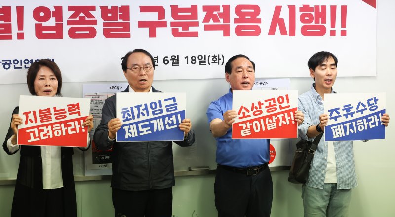18일 오전 서울 영등포구 소상공인연합회 대회의실에서 열린 '2025년도 최저임금 소상공인 입장 발표 기자회견'에서 소상공인들이 구호를 외치고 있다. 연합뉴스 |
