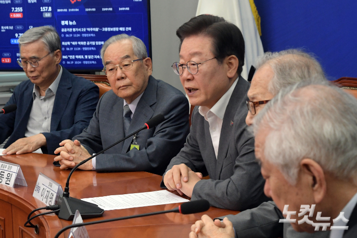 더불어민주당 이재명 대표가 19일 서울 여의도 국회에서 열린 '한반도 긴장 완화를 위한 긴급 간담회에서 발언을 하고 있다. 이날 간담회에는 임동원·정세현·이종석 前 통일부 장관, 문정인 前 통일외교안보 특보, 박지원 前 국가정보원장 등이 참석했다. 윤창원 기자 |