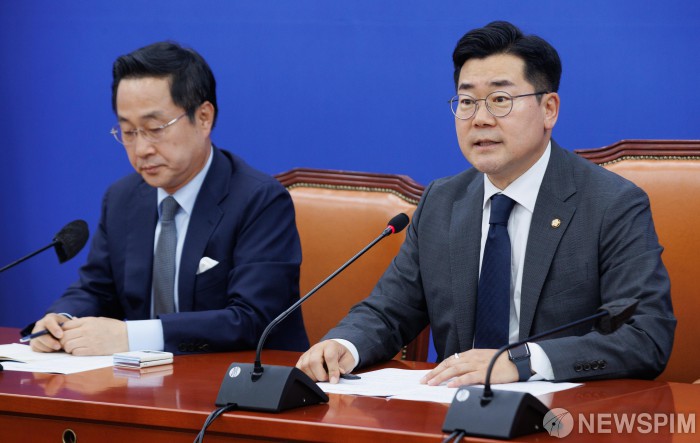 [서울=뉴스핌] 윤창빈 기자 = 박찬대 더불어민주당 원내대표가 19일 오후 서울 여의도 국회에서 국회 원 구성 관련 언론브리핑을 하고 있다. 2024.06.19 pangbin@newspim.com
