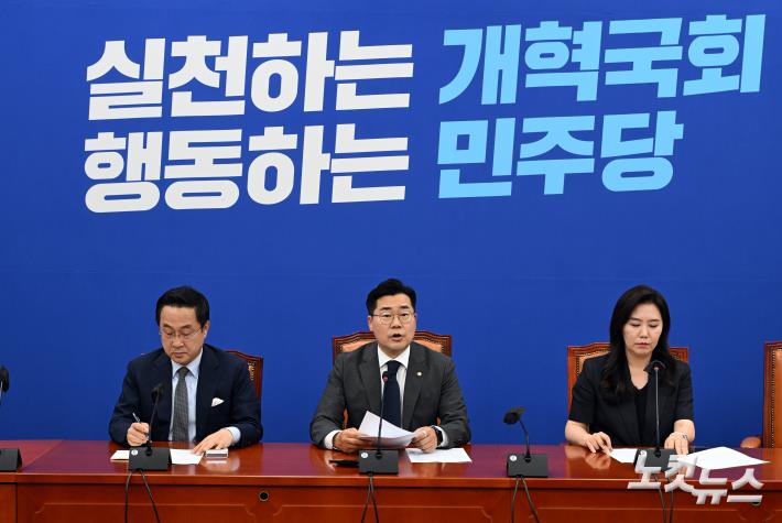 더불어민주당 박찬대 원내대표가 19일 서울 여의도 국회에서 기자간담회를 열고 국민의힘 추경호 원내대표의 원 구성 제안에 대한 입장을 밝히고 있다.