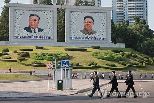 김일성 광장에 걸린 김정은 위원장과 푸틴 대통령의 대형 초상화 |