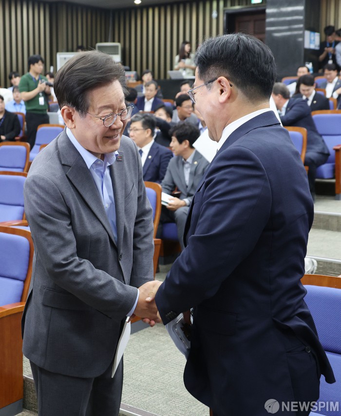 [서울=뉴스핌] 이형석 기자 = 이재명 더불어민주당 대표(왼쪽)와 박찬대 원내대표가 20일 오후 서울 여의도 국회에서 열린 의원총회에서 악수를 하고 있다. 2024.06.20 leehs@newspim.com