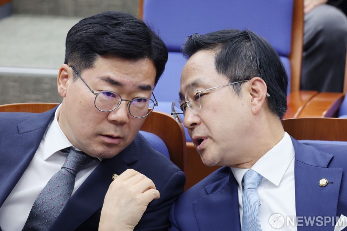 [서울=뉴스핌] 이형석 기자 = 박찬대 더불어민주당 원내대표(왼쪽)와 박성준 원내수석부대표가 20일 오후 서울 여의도 국회에서 열린 의원총회에서 대화를 나누고 있다. 2024.06.20 leehs@newspim.com