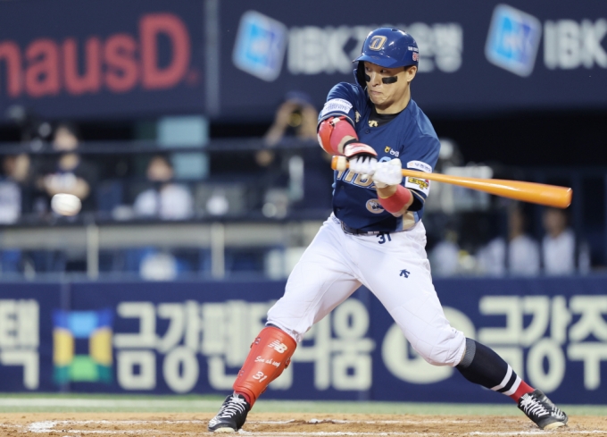 20일 서울 송파구 잠실야구장에서 열린 2024 KBO리그 NC 다이노스와 두산 베어스의 경기, 6회초 2사 주자없는 상황 NC 손아섭이 안타를 치고 있다. 손아섭은 이 안타로 KBO리그 통산 안타 수를 2505개를 기록하며 최다 안타 신기록을 수립했다. /사진=뉴시스 |