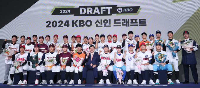 지난해 열린 ‘2024 KBO 신인 드래프트’에서 허구연 KBO 총재와 지명 선수들이 기념촬영을 하고 있다. 뉴시스 |