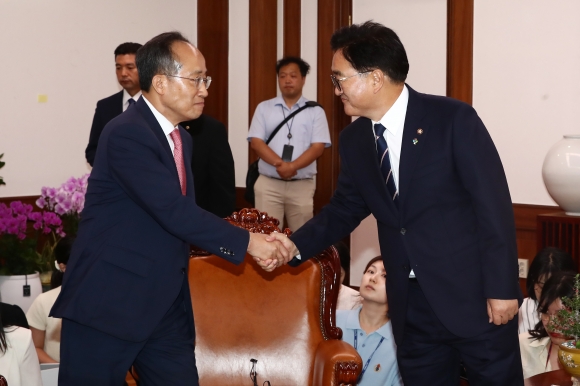 우원식 국회의장이 21일 오후 국회의장실에서 원 구성을 위한 양당 원내대표 회동에서 국민의힘 추경호 원내대표와 악수하고 있다. 2024.6.21 공동취재 |