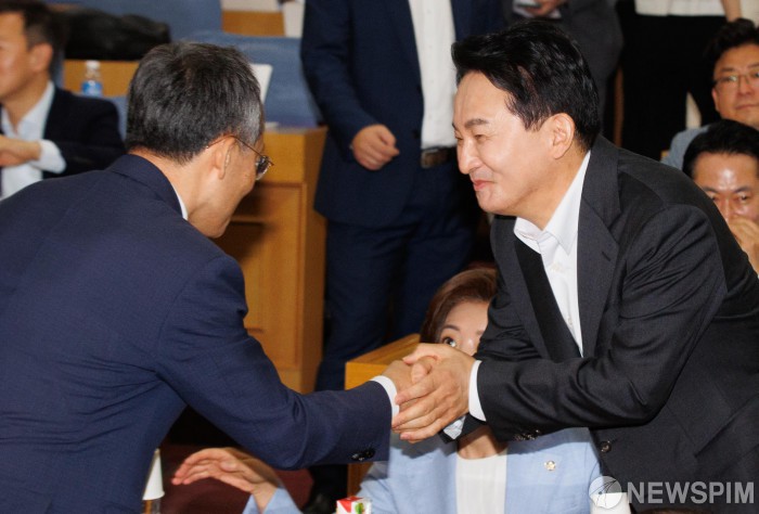 [서울=뉴스핌] 윤창빈 기자 = 원희룡 국민의힘 당대표 후보, 추경호 원내대표가 24일 오전 서울 여의도 국회 의원회관에서 열린 국민의힘 초선의원 공부모임에서 인사를 나누고 있다. 2024.06.24 pangbin@newspim.com