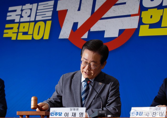 [서울=뉴스핌] 윤창빈 기자 = 이재명 더불어민주당 대표가 24일 오전 서울 여의도 국회에서 열린 최고위원회의에서 의사봉을 두드리고 있다. 2024.06.24 pangbin@newspim.com |