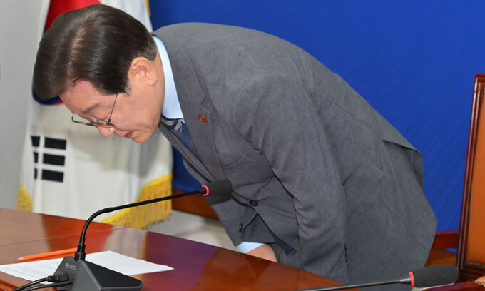 “사임합니다” 더불어민주당 이재명 대표가 24일 서울 여의도 국회에서 열린 최고위원회의를 마치고 당대표직 사임 의사를 밝힌 뒤 인사하고 있다. 남제현 선임기자 |