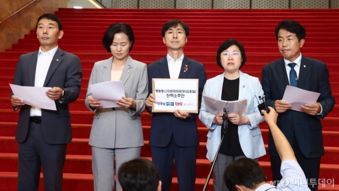민주당·조국혁신당·진보당·사회민주당·새로운미래 등은 이날 오후 5시쯤 서울 여의도 국회 본청에서 공동 기자회견을 연 뒤 곧바로 국회 의안과에 김 방통위원장에 대한 탄핵소추안을 제출했다. 탄핵소추 사유는 △위법한 2인 의결 △부당한 YTN 최다액출자자 변경승인 △방심위에 관리소홀에 따른 직무유기 △국회 출석 및 자료요구 거부 △TBS에 대한 관리소홀 등 5가지다.