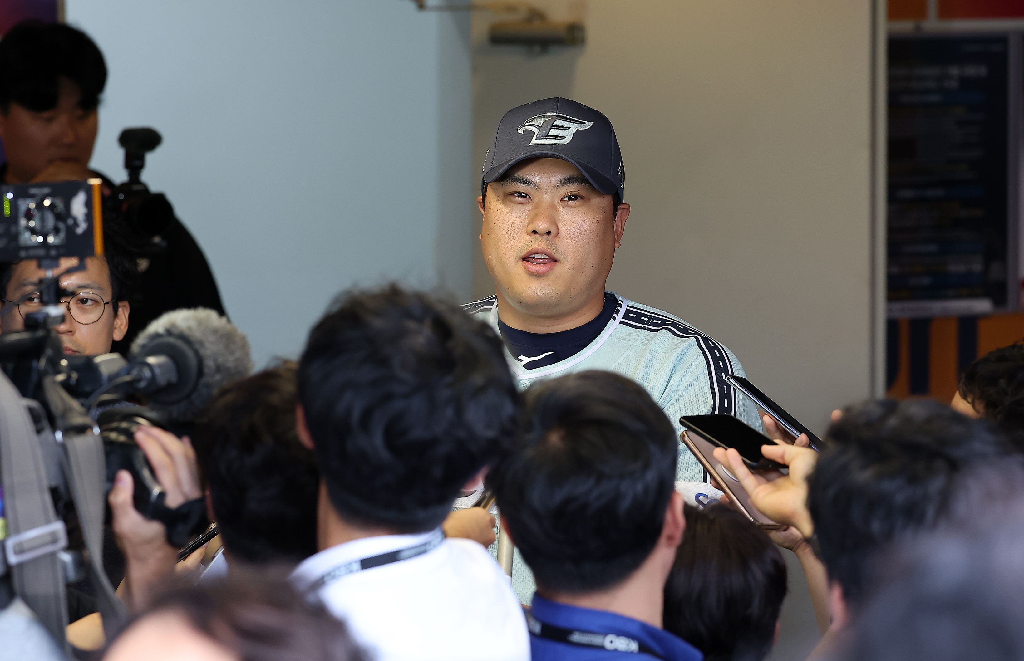 류현진이 6일 오후 인천 SSG랜더스필드에서 KBO 올스타전에 앞서 취재진과 인터뷰를 하고 있다. /뉴스1 |