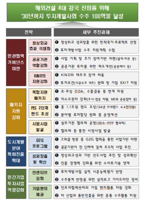 이와함께 투자개발 전문 기관인 해외인프라도시개발공사(KIND)의 기업 지원 기능을 더욱 강화하기로 했다.