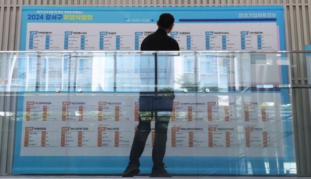26일 서울 강서구 마곡동 서울창업허브 엠플러스에서 열린 2024 강서구 취업박람회에서 구직자들이 채용정보를 살펴보고 있다. |