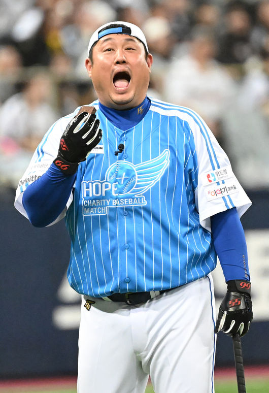 [OSEN=고척, 김성락 기자] 26일 오후 서울 고척스카이돔에서 2021 희망더하기 자선야구대회가 열렸다.3회초 시작에 앞서 티볼 홈런레이스 이벤트에서 종범신팀 최준석이 오예스를 먹고 있다. 2023.11.26 / ksl0919@osen.co.kr |