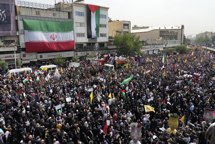 1일(현지시간) 이란 테헤란 이슬람혁명 광장에서 열린 하마스 수장 이스마일 하니예의 장례식에 수많은 인파가 몰려 있다. AP연합뉴스 |