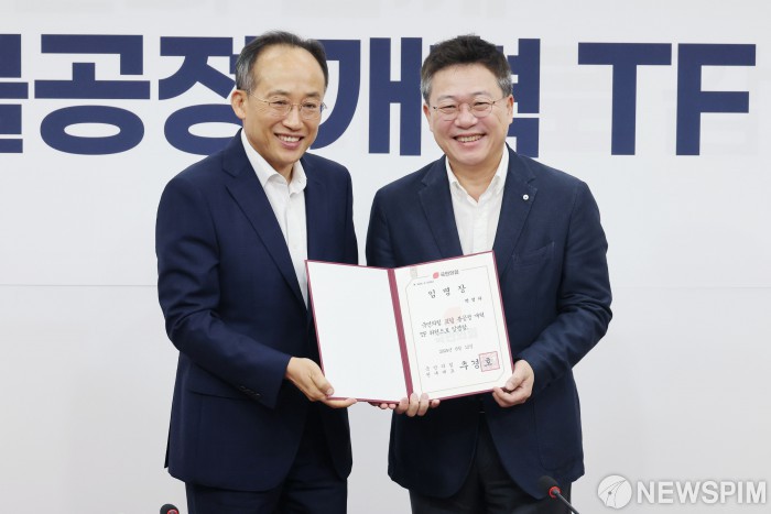 [서울=뉴스핌] 이형석 기자 = 추경호 국민의힘 원내대표가 12일 오전 서울 여의도 국회에서 열린 ‘포털 불공정 개혁 TF’ 임명장 수여식 및 1차 회의에서 박정하 위원에게 임명장을 수여하고 있다. 2024.08.12 leehs@newspim.com