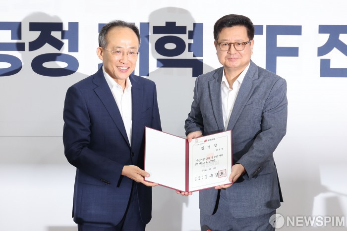 [서울=뉴스핌] 이형석 기자 = 추경호 국민의힘 원내대표가 12일 오전 서울 여의도 국회에서 열린 ‘포털 불공정 개혁 TF’ 임명장 수여식 및 1차 회의에서 김장겸 위원에게 임명장을 수여하고 있다. 2024.08.12 leehs@newspim.com