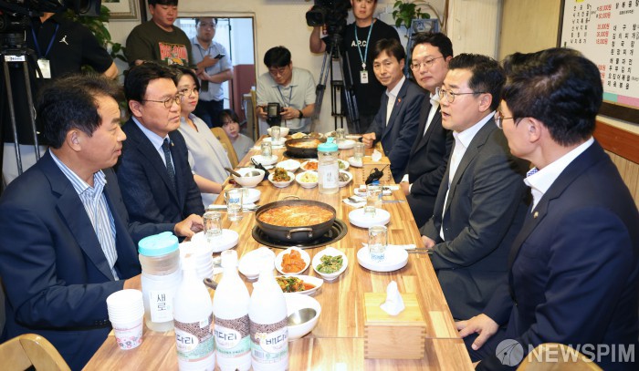 [서울=뉴스핌] 이형석 기자 = 더불어민주당을 비롯한 6개 야당 원내대표들이 13일 오후 서울 여의도의 한 식당에서 만찬 회동을 하고 있다. 이날 회동에서는 야당 단독으로 의결한 법안들에 윤석열 대통령이 재의 요구권(거부권)을 행사하는 상황이 반복되는 데 대한 대응 방안 등을 논의한다. 왼쪽부터 시계방향으로 윤종오 진보당·황운하 조국혁신당·용혜인 기본소득당·한창민 사회민주당·천하람 개혁신당·박찬대 더불어민주당 원내대표. 정진욱 더불어민주당 원내대표 비서실장. 2024.08.13 leehs@newspim.com |
