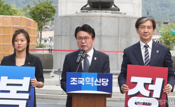 [서울=뉴스핌] 최지환 기자 = 황운하 조국혁신당 원내대표가 15일 오전 서울 종로구 광화문광장에서 열린 윤석열 정권 대일외교 규탄 및 김형석 독립기념관장 임명철회 촉구 기자회견에서 발언하고 있다. 2024.08.15 choipix16@newspim.com