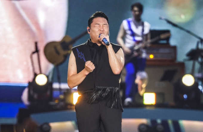 가수 싸이가 17일 인천 서구 인천아시아드주경기장에서 열린 흠뻑쇼에서 공연을 펼치고 있다. /사진=뉴시스 |