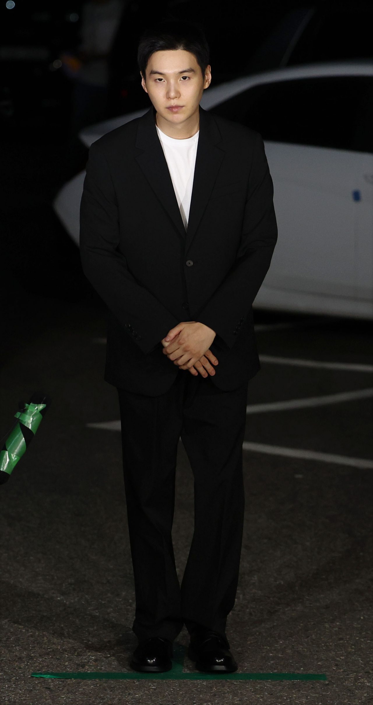 만취 상태로 전동스쿠터를 몬 혐의를 받는 그룹 방탄소년단(BTS)의 슈가(민윤기)가 경찰 조사를 위해 23일 오후 서울 용산경찰서로 출석하며 포토라인에 서고 있다. [연합] |