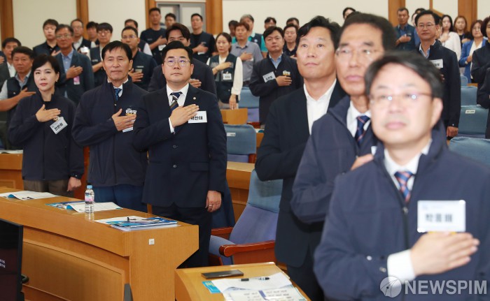 [서울=뉴스핌] 이형석 기자 = 박찬대 더불어민주당 원내대표를 비롯한 참석자들이 2일 오전 서울 여의도 국회 의원회관에서 열린 노동존중실천단 출범식에서 국기에 대한 경례를 하고 있다. 2024.09.02 leehs@newspim.com