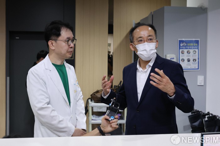 [서울=뉴스핌] 윤창빈 기자 = 추경호 국민의힘 원내대표가 12일 오전 추석명절 대비 응급진료체계 현장방문차 서울 동대문구 린 여성병원을 방문해 병동을 둘러보고 있다. 2024.09.12 pangbin@newspim.com |