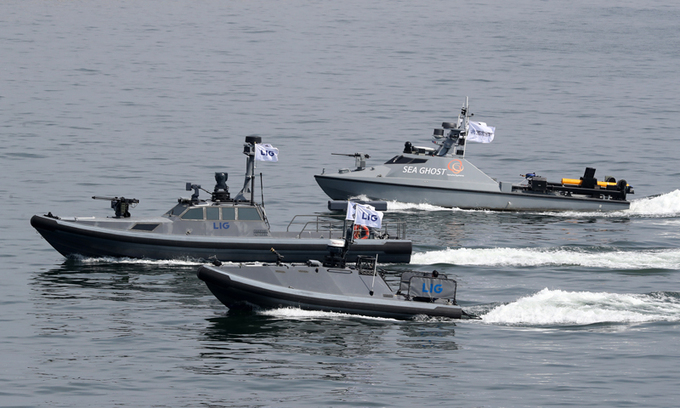 부산 남구 해군작전사령부 부산작전기지에서 해양 유·무인 복합전투체계 ‘네이비 씨 고스트’를 적용한 상륙작전 시연에 참가한 무인수상정들이 항해를 하고 있다. 세계일보 자료사진 |