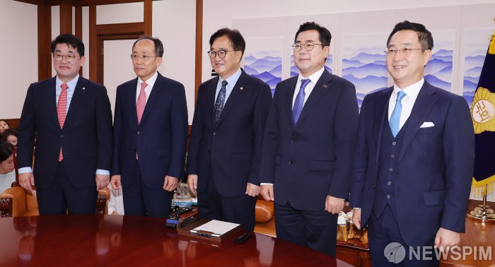 [서울=뉴스핌] 이형석 기자 = 우원식 국회의장이 19일 오전 서울 여의도 국회에서 여야 원내대표 회동을 주재 하고 있다. 왼쪽부터 배준영 국민의힘 원내수석부대표, 추경호 원내대표, 우 의장, 박찬대 더불어민주당 원내대표, 박성준 원내수석부대표. 2024.09.19 leehs@newspim.com
